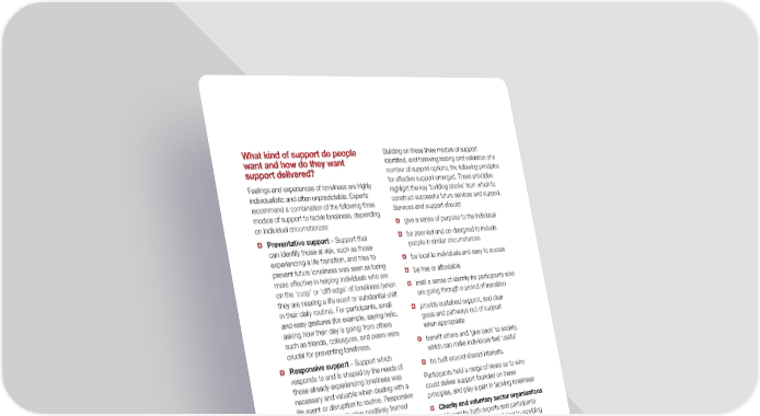 What kind of support do people Building on these three models of support want and how do they want identified, and following testing and validation of a support delivered? number of support options, the following principles for effective support emerged. These principles Feelings and experiences of loneliness are highly highlight the key ‘building blocks’ from which to individualistic and often unpredictable. Experts construct successful future services and support. recommend a combination of the following three Services and support should: models of support to tackle loneliness, depending give a sense of purpose to the individual on individual circumstances:¤ be peer-led and co-designed to include Preventative support – Support that ¤ ¤ can identify those at risk, such as those people in similar circumstances experiencing a life transition, and tries to be local to individuals and easy to access ¤ prevent future loneliness was seen as being more effective in helping individuals who are ¤ be free or affordable on the ‘cusp’ or ‘cliff edge’ of loneliness (when instil a sense of identity for participants who ¤ they are nearing a life event or substantial shift are going through a period of transition in their daily routine). For participants, small provide sustained support, and clear and easy gestures (for example, saying hello, ¤ asking how their day is going) from others goals and pathways out of support such as friends, colleagues, and peers were when appropriate benefit others and ‘give back’ to society, crucial for preventing loneliness.¤ which can make individuals feel ‘useful’ Responsive support – Support which ¤ be built around shared interests. responds to and is shaped by the needs of ¤ those already experiencing loneliness was Participants held a range of views as to who necessary and valuable when dealing with a could deliver support founded on these life event or disruption to routine. Responsive principles, and play a part in tackling loneliness: support needs to involve positively framed Charity and voluntary sector organisations and user-centred activities. Effective types ¤ of responsive support were seen as those – Viewed by both experts and participants that give individuals a clear purpose, help as being the most closely linked to providing them forge new relationships, develop new services to tackle loneliness historically. These interests, or rediscover old skills through organisations were seen as being able to volunteering or taking a night class. Meeting help community organisations to grow public others going through similar experiences was support and provide momentum around a also key for some participants. ‘call to action’, using their brand credibility from working at grass roots level to build Restorative support – Support which can ¤ support for campaigning. help those who are at risk of slipping into Individuals in communities – Experts chronic loneliness (i.e. loneliness which is ¤ experienced over a longer period) to re-believe that building resilience in communities engage was most successfully implemented so individuals can reduce the likelihood when an individual is trying to reconnect of loneliness hinges on the inclusion of with their community but may need some community members in the design of future added support to achieve this. It is therefore services, ensuring services are tailored, important that people are supported to rebuild relevant and fit for local need. Peer-led their confidence and use this newfound support was identified as necessary, self-assurance to forge new connections.encouraging individuals to connect with others who had been in similar circumstances but had managed to overcome them. Executive summary 9