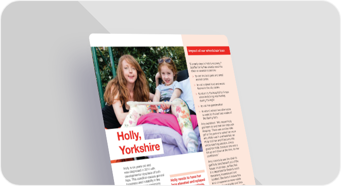 Impact of our wheelchair loan 20 It is early days in Holly’s recovery, but the family has already used the chair on several occasions: > to visit the local park and small animal centre > to visit a street food and music festival in the city centre > to return to the hospital for X-rays when Holly’s leg was hurting during the night > to visit her grandmother > to attend school two afternoons a week for the last two weeks of the Spring term. Amy explained: “this meant Holly Holly, got fresh air and that can help with sleeping. There was another little girl at the park who asked her mum why Holly was in a wheelchair, so Yorkshire Holly told her and it became this whole teaching session...it was good for Holly, because she was a bit up and down at the time, for her Holly is six years old and confidence.” was diagnosed in 2014 with Amy intends to use the chair to developmental dysplasia of both get Holly (and herself) out of the hips. This condition causes general house most days, as they feel looseness and instability in the Holly needs to have her it is important for them to avoid hip joints. It is more commonly becoming housebound and diagnosed in younger infants, when legs elevated and splayed isolated. She feels it makes this it can be corrected fairly easily with following her operations, kind of experience more visible surgery. Due to the relatively late and a wheelchair is an in the local community and thus diagnosis, Holly had to undergo essential part of her encourages a sense of community an urgent double hip operation physical and emotional support and acceptance, rather to stabilise both hips. This meant recovery. It prevents her than feelings of being stigmatised, Holly had to be in a cast with her which could have a detrimental legs splayed and supported for two family being housebound effect on Holly’s sense of wellbeing. months following each hip operation and transports her to the Amy feels having the wheelchair is – a total of nearly four months GP and hospital for follow- also benefitting her own wellbeing: altogether. up. Being housebound for “not being cooped up, and not Holly’s mum (Amy) has taken time off four months would have a being so isolated. It would be very from her part-time job as a midwife. serious effect on Holly’s easy to become quite lonely and, With the support of her partner social skills, confidence as a parent, it would be really and extended family, she is looking with other children and hard to watch Holly’s distress after Holly at home. Holly also has and frustration when she can’t Vitamin D deficiency, so needs to education. The wheelchair get out.” Without the wheelchair have access to sunlight on a regular helps her parents to cope loan, the family would likely have basis. The family found out about and avoids the distress needed extra emotional support the Red Cross short-term wheelchair and pain of an isolating to cope with four months of being loan service from the occupational and frustrating long housebound. therapist and physiotherapist during recovery period. Holly’s pre-operation appointment at Sheffield Children’s Hospital. 20 The interview took place after Holly’s first operation and before the second one. 22