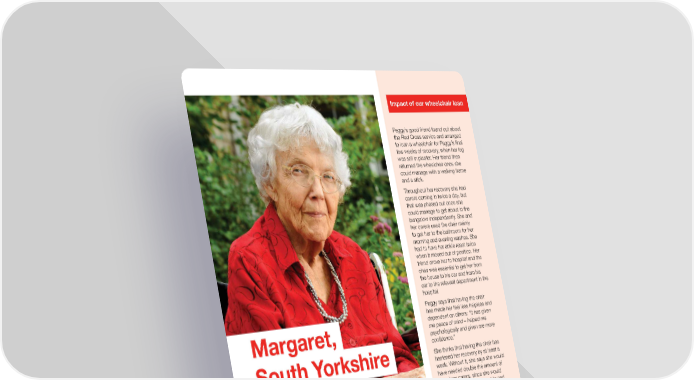 Impact of our wheelchair loan Peggy’s good friend found out about the Red Cross service and arranged to loan a wheelchair for Peggy’s final few weeks of recovery, when her leg was still in plaster. Her friend then returned the wheelchair once she could manage with a walking frame and a stick. Throughout her recovery she had carers coming in twice a day, but that was phased out once she could manage to get about in the bungalow independently. She and her carers used the chair mainly to get her to the bathroom for her morning and evening washes. She had to have her ankle reset twice when it moved out of position. Her friend drove her to hospital and the chair was essential to get her from the house to his car and from his car to the relevant department in the hospital. Peggy says that having the chair has made her feel less helpless and dependent on others: “It has given Margaret, me peace of mind – helped me psychologically and given me more confidence.” South Yorkshire She thinks that having the chair has hastened her recovery by at least a week. Without it, she says she would have needed double the amount of time from carers, since she would have needed support to get to and from the bathroom. She would also have needed an ambulance, a Margaret (Peggy) is 89 and lives Having a short-term wheelchair and a porter to get her to independently in a bungalow. At the wheelchair meant that and from the hospital for her follow- end of 2014, she broke her ankle. Peggy was able to move up appointments. She commented Social services recommended around her home, making that, without the chair, there was a initially that she should go into a risk that she would have fallen and care home to recover following her her less dependent on had an accident while trying to get discharge from hospital, with her others and giving her more about at home. ankle in a cast. She did not want to confidence. Without the Peggy is part of a supportive do this and the local authority found short-term wheelchair community of older friends and her a wheelchair. With this and the she feels she would have neighbours. They have valued support of friends, she was able to required a much higher helping with her recovery and they return home. However, the chair was level of support from her too would have been disempowered recalled for another service user carers and would not have if she had not had the wheelchair. after less than two months. been able to engage with her community of friends as much as she wanted. 28