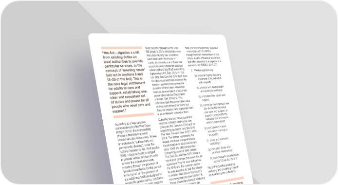Most recently, throughout the Care that is written into primary legislation “the Act…signifies a shift Bill debate in 2013, wheelchairs were – resonates with the NHS’s from existing duties on discussed on only four occasions, recognition that a wheelchair is “not local authorities to provide each time within the House of simply a piece of medical equipment, particular services, to the Lords, and on only one of these four but often essential to all aspects of a occasions were wheelchair services person’s life” (NHSIQ, 2014: 37): concept of ‘meeting needs’ referenced and identified as requiring 2. “Wellbeing [refers to:] (set out in sections 8 and improvement (HL Deb, 2013-14: 745 18–20 of the Act). This is col. 818). The Care Act 2014 itself does (a) personal dignity (including the core legal entitlement not discuss wheelchairs; however the treatment of the individual for adults to care and statutory guidance recognises the with respect); support, establishing one provision of short-term wheelchair (b) physical and mental health loans as an example of a secondary and emotional wellbeing; clear and consistent set preventative service (Department of duties and power for all of Health, DH, 2014a: 9). This (c) protection from abuse and people who need care and acknowledges the preventative value neglect; support.” of short-term wheelchair loans, but (d) control by the individual over does not create a duty to provide them day-to-day life (including or an entitlement to receive them. over care and support, or According to a legal analysis Currently, the two most significant support, provided to the commissioned by the Red Cross sources of health and social care individual and the way in 9 policy are the Care Act 2014 and its which it is provided); (Knight, 2014), the responsibility of local authorities to provide supporting guidance, and the NHS (e) participation in work, wheelchairs also lacks clarity. Where Five Year Forward View (5YFV; NHS, education, training or an individual is “substantially and 2014). The former represents the recreation; permanently disabled”, under the largest and most comprehensive National Assistance Act 1948 (section transformation of adult social care (f) social and economic 29(1)), a local authority is obliged since 1948; the latter presents a wellbeing; to provide welfare services in order compelling vision of NHS reform. (g) domestic, family and to meet the individual’s needs, The Care Act and the 5YFV share a personal relationships; including through the provision of number of priorities that make this an “practical assistance for that person opportune time for local authorities, (h) the individual’s contribution to in his home” or “the provision of the NHS and the voluntary sector society” (Care Act, 2014: 1). any additional facilities designed to to work together to ‘put the wheels The 5YFV identifies promoting secure his greater safety, comfort or in motion’ and deliver this report’s wellbeing and preventing ill health convenience”, as found in sections recommendations (see Section 4). as the main goals of the NHS 2(1)(a) and (e) of the Chronically Sick These shared priorities of wellbeing, and Disabled Persons Act 1970. integration and prevention are However, because most people who explored below. need short-term wheelchair loan Wellbeing “The concept of ‘meeting will not conform to these stringent The Care Act 2014 reframes the social needs’ recognises that criteria, local authorities, according care responsibilities and activities of everyone’s needs are to the 1970 Act, will not be obliged to local authorities within the concept of different and personal to provide one. promoting individual wellbeing (Care them. Local authorities While there are many powers Act, 2014: 1). The statutory guidance must consider how to that might be said to enable a is clear that “the core purpose of meet each person’s local authority to make short-term adult care and support is to help specific needs rather wheelchair loan available (Section 29 people to achieve the outcomes that than simply considering of the 1948 Act and Section 45 of matter to them in their life…local what service they will fit the Health Service and Public Health authorities must promote wellbeing Act, 1968, in relation to older people; when carrying out any of their care into. The concept…also and Section 3 of the Carers (Equal and support functions in respect of recognises that modern 10 Opportunities) Act 2004 ) there is no a person (DH, 2014a: 1; bold and care and support can be statutory duty requiring them to do so underline in the original). provided in any number (Knight, 2014). Despite short-term wheelchair loans of ways, with new models 9 Prior to the Care Act coming into force on 1st being omitted from the legislation, emerging all the time….” April 2015. the Care Act’s new framework of (DH 2014a: 2). 10 This duty might require a local authority to promoting individual wellbeing – request a wheelchair is provided to a disabled including the definition of ‘wellbeing’ person to ease the burden on a carer. 5