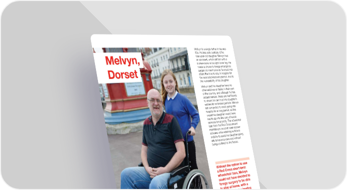 Melvyn is a single father in his mid- 50s. He has sole custody of his nine-year-old daughter. Melvyn had Melvyn, an accident, which left him with a broken bone in his right lower leg. He made a choice to forego emergency surgery to insert pins as he could not Dorset afford the time to stay in hospital for the extended recovery period, due to the vulnerability of his daughter. Melvyn and his daughter have no other relatives or family in their part of the country, and although he has acquaintances, these are not friends to whom he can trust his daughter’s welfare for extended periods. Melvyn felt compelled to avoid going into hospital for a long period, as this meant his daughter would have had to go into the care of social services temporarily. The wheelchair loan from the Red Cross meant that Melvyn could at least recover at home while retaining sufficient mobility to avoid his daughter going into temporary care and without being confined to the house. Without the option to use a Red Cross short-term wheelchair loan, Melvyn could not have decided to forego surgery to be able to stay at home, with a chance of his leg healing temporarily. He would not have been able to leave the house for at least six weeks and probably longer, and he would not have been in a fit state to ensure his daughter would not be socially isolated during a key part of her development, recovery and social re-integration. There is a risk that going into the care of social services would have had a very negative effect on his daughter’s wellbeing. 18