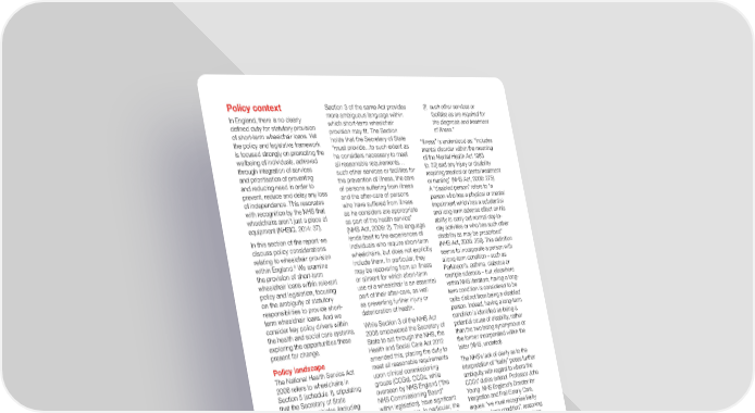 Policy context Section 3 of the same Act provides (f) such other services or In England, there is no clearly more ambiguous language within facilities as are required for defined duty for statutory provision which short-term wheelchair the diagnosis and treatment of short-term wheelchair loans. Yet provision may fit. The Section of illness.” the policy and legislative framework holds that the Secretary of State “Illness” is understood as: “includes is focused strongly on promoting the “must provide…to such extent as mental disorder within the meaning wellbeing of individuals, achieved he considers necessary to meet of the Mental Health Act 1983 through integration of services all reasonable requirements… (c. 20) and any injury or disability and prioritisation of preventing such other services or facilities for requiring medical or dental treatment and reducing need in order to the prevention of illness, the care or nursing” (NHS Act, 2006: 275). prevent, reduce and delay any loss of persons suffering from illness A “disabled person” refers to “a of independence. This resonates and the after-care of persons person who has a physical or mental with recognition by the NHS that who have suffered from illness impairment which has a substantial wheelchairs aren’t just a piece of as he considers are appropriate and long-term adverse effect on his equipment (NHSIQ, 2014: 37). as part of the health service” ability to carry out normal day-to- (NHS Act, 2006: 2). This language day activities or who has such other In this section of the report we lends itself to the experiences of disability as may be prescribed” discuss policy considerations individuals who require short-term (NHS Act, 2006: 256). This definition relating to wheelchair provision wheelchairs, but does not explicitly seems to incorporate a person with 8 within England. We examine include them. In particular, they a long-term condition – such as the provision of short-term may be recovering from an illness Parkinson’s, asthma, diabetes or wheelchair loans within relevant or ailment for which short-term multiple sclerosis – but, elsewhere policy and legislation, focusing use of a wheelchair is an essential within NHS literature, having a long- on the ambiguity of statutory part of their after-care, as well term condition is considered to be responsibilities to provide short- as preventing further injury or quite distinct from being a disabled term wheelchair loans. And we deterioration of health. person. Indeed, having a long-term consider key policy drivers within While Section 3 of the NHS Act condition is identified as being a the health and social care systems, 2006 empowered the Secretary of potential cause of disability, rather exploring the opportunities these State to act through the NHS, the than the two being synonymous or present for change. Health and Social Care Act 2012 the former incorporated within the Policy landscape amended this, placing the duty to latter (NHS, undated). The National Health Service Act meet all reasonable requirements The NHS’s lack of clarity as to the 2006 refers to wheelchairs in upon clinical commissioning interpretation of “frailty” poses further Section 5 (schedule 1), stipulating groups (CCGs). CCGs, while ambiguity with regard to whom the that the Secretary of State overseen by NHS England (“the CCGs’ duties extend. Professor John “may provide vehicles (including NHS Commissioning Board” Young, NHS England’s Director for wheelchairs) for persons appearing within legislation), have significant Integration and Frail Elderly Care, to him to be persons who have a devolved powers. In particular, the argues: “we must recognise frailty physical impairment which has a amendments made by Section 13 as a long-term condition”, reasoning substantial and long-term adverse of the 2012 Act to Section 3 of the that: “frailty behaves just like a long- effect on their ability to carry 2006 Act provide that: term condition. It is progressive, it out normal day-to-day activities” 1. “A clinical commissioning group impacts adversely on life experience (179; italics added). This explicitly must arrange for the provision of and – if unmanaged – it can cause excludes short-term wheelchair the following to such extent as the sufferer to become very sick, very provision. it considers necessary to meet quickly” (Young, 2014). However, this the reasonable requirements interpretation does not seem to have 8 Information about the policy context within of the persons for whom it has been adopted formally within the Scotland is available within the British Red responsibility: NHS. Cross report Making a move: increasing choice and independence for people with short-term mobility needs, which is available … As in the 2006 Act, the duty to online: http://www.redcross.org.uk/~/media/ provide a wheelchair for short-term BritishRedCross/Documents/About%20us/ (e) such other services or Scotland%20mobility%20aids%20report.pdf facilities for the prevention of use is ambiguous in the 2012 Act. Information about the policy context within CCGs need only meet “reasonable Wales is available within the National Assembly illness, the care of persons requirements” in providing services; for Wales Health and Social Care Committee suffering from illness and the report Wheelchair services in Wales: follow-up the terms of which are not defined inquiry, which is available online: http://www. after-care of persons who and are therefore susceptible to assembly.wales/Laid%20Documents/CR- have suffered from illness LD9028%20-%20Health%20and%20Social%20 inconsistent interpretation, or, as is Care%20Committee%20Report%20on%20 as the group considers are presently the case, are interpreted Wheelchair%20Services%20in%20Wales%20 appropriate as part of the Follow-up%20Inquiry%20-13082012-237712/ by the NHS to preclude short-term cr-ld9028-English.pdf health service, wheelchair provis