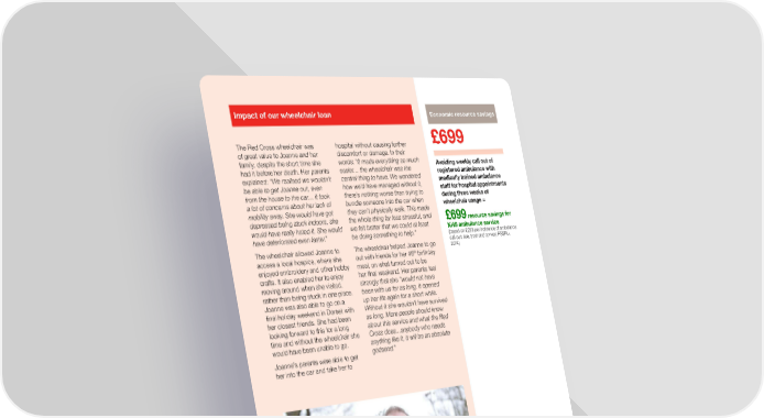 Impact of our wheelchair loan Economic resource savings The Red Cross wheelchair was hospital without causing further £699 of great value to Joanne and her discomfort or damage. In their family, despite the short time she words: “It made everything so much Avoiding weekly call out of had it before her death. Her parents easier… the wheelchair was the registered ambulance with explained: “We realised we wouldn’t central thing to have. We wondered medically trained ambulance be able to get Joanne out, even how we’d have managed without it, staff for hospital appointments from the house to the car… it took there’s nothing worse than trying to during three weeks of a lot of concerns about her lack of bundle someone into the car when wheelchair usage = mobility away. She would have got they can’t physically walk. This made depressed being stuck indoors, she the whole thing far less stressful, and £699 resource savings for would have really hated it. She would we felt better that we could at least NHS ambulance service have deteriorated even faster.” be doing something to help.” (based on £233 per incidence of ambulance The wheelchair allowed Joanne to The wheelchair helped Joanne to go call out: see, treat and convey; PSSRU, 2014) th access a local hospice, where she out with friends for her 48 birthday enjoyed embroidery and other hobby meal, on what turned out to be crafts. It also enabled her to enjoy her final weekend. Her parents feel moving around when she visited, strongly that she “would not have rather than being stuck in one place. been with us for as long. It opened Joanne was also able to go on a up her life again for a short while. final holiday weekend in Dorset with Without it she wouldn’t have survived her closest friends. She had been as long. More people should know looking forward to this for a long about this service and what the Red time and without the wheelchair she Cross does…anybody who needs would have been unable to go. anything like it, it will be an absolute Joanne’s parents were able to get godsend.” her into the car and take her to 27