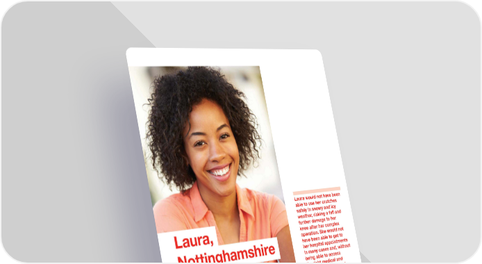 Laura would not have been able to use her crutches safely in snowy and icy weather, risking a fall and further damage to her Laura, knee after her complex operation. She would not have been able to get to Nottinghamshire her hospital appointments in many cases and, without being able to access the right medical and physiotherapy support, her recovery would have taken longer and she would Laura is 20 years old and for the a scan, which revealed that her have had to arrange for last five years has struggled with cruciate ligaments were missing medical home visits when repeated dislocations of her knee, and other ligaments in her knee the bad weather stopped forcing her to manage with crutches were severely damaged. At the her getting to the local GP for six months at a time on two beginning of December 2014 she separate occasions. Laura feels had a long and complex operation clinic safely. In addition, it that if she had known about the to reconstruct her knee ligaments. is highly likely that if she Red Cross short-term wheelchair Laura is now taking a ‘recovery did not have a wheelchair loan service on those occasions, it gap year’ before taking up her to help her get around would have made a big difference place at Liverpool University. The and out of the house, she to her life, as she was completely occupational therapist at the hospital would have needed further dependent on relatives and friends told Laura about the Red Cross to get her out and around the house. short-term wheelchair loan service, support during the week When intensive physiotherapy failed and she has used it since her from a care worker. to solve the problem, Laura had discharge. 20