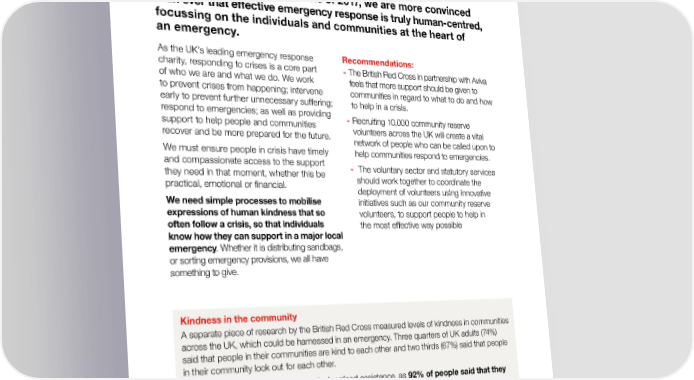 4. Harnessing the power of kindness in a crisis Following the significant events of 2017, we are more convinced than ever that effective emergency response is truly human-centred, focussing on the individuals and communities at the heart of an emergency. As the UK’s leading emergency response Recommendations: charity, responding to crises is a core part - The British Red Cross in partnership with Aviva of who we are and what we do. We work feels that more support should be given to to prevent crises from happening; intervene communities in regard to what to do and how early to prevent further unnecessary suffering; to help in a crisis. respond to emergencies; as well as providing - Recruiting 10,000 community reserve support to help people and communities volunteers across the UK will create a vital recover and be more prepared for the future. network of people who can be called upon to We must ensure people in crisis have timely help communities respond to emergencies. and compassionate access to the support - The voluntary sector and statutory services they need in that moment, whether this be should work together to coordinate the practical, emotional or financial. deployment of volunteers using innovative We need simple processes to mobilise initiatives such as our community reserve expressions of human kindness that so volunteers, to support people to help in often follow a crisis, so that individuals the most effective way possible know how they can support in a major local emergency. Whether it is distributing sandbags, or sorting emergency provisions, we all have something to give. Kindness in the community A separate piece of research by the British Red Cross measured levels of kindness in communities across the UK, which could be harnessed in an emergency. Three quarters of UK adults (74%) said that people in their communities are kind to each other and two thirds (67%) said that people in their community look out for each other. The findings also support the desire for localised assistance, as 92% of people said that they appreciate acts of kindness from neighbours or people in their community. This research also demonstrated the role that the British Red Cross could play in mobilising this kindness. More than four in five UK adults (83%) said they would trust British Red Cross to encourage people to use simple acts of kindness to help each other. Source: Reference 3. 12