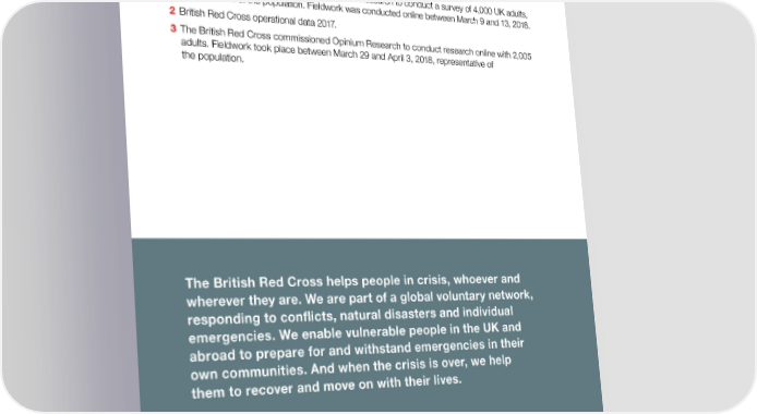 References 1 The British Red Cross commissioned Opinium Research to conduct a survey of 4,000 UK adults, representative of the population. Fieldwork was conducted online between March 9 and 13, 2018. 2 British Red Cross operational data 2017. 3 The British Red Cross commissioned Opinium Research to conduct research online with 2,005 adults. Fieldwork took place between March 29 and April 3, 2018, representative of the population. The British Red Cross helps people in crisis, whoever and wherever they are. We are part of a global voluntary network, responding to conflicts, natural disasters and individual emergencies. We enable vulnerable people in the UK and abroad to prepare for and withstand emergencies in their own communities. And when the crisis is over, we help them to recover and move on with their lives. British Red Cross 44 Moorfields London EC2Y 9AL redcross.org.uk The British Red Cross Society, incorporated by Royal Charter 1908, is a charity registered in England and Wales (220949), Scotland (SC037738) and Isle of Man (0752). Cover photo © Howie Laws/British Red Cross.