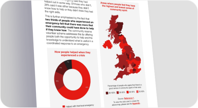 Overall, two thirds of people (66%) who had experienced an emergency said they had Areas where people feel they have helped out in some way. Of those who didn’t, the highest and lowest sense of 26% said it was either because they didn’t community spirit know how to help or they didn’t think they had the right skills. This is further emphasised by the fact that two thirds of people who experienced an emergency felt that there was more that their community could have done to help if they knew how. The community reserve volunteer scheme addresses this by offering people both the opportunity to help and the knowledge to understand what is useful in a coordinated response to an emergency. How people helped when they experienced a crisis 7% 11% 15% 66% Percentage of people who agree that there is a good sense of community spirit in their area: 96-100% 90-95% 86-90% 80-85% Source: . Reference 1 Helped with their local emergency To view the data used to create the above map, please see the . Appendix Wanted to help, but didn’t know how Wanted to help, but didn’t think they had the skills Did not want to help Source: . Reference 1 8